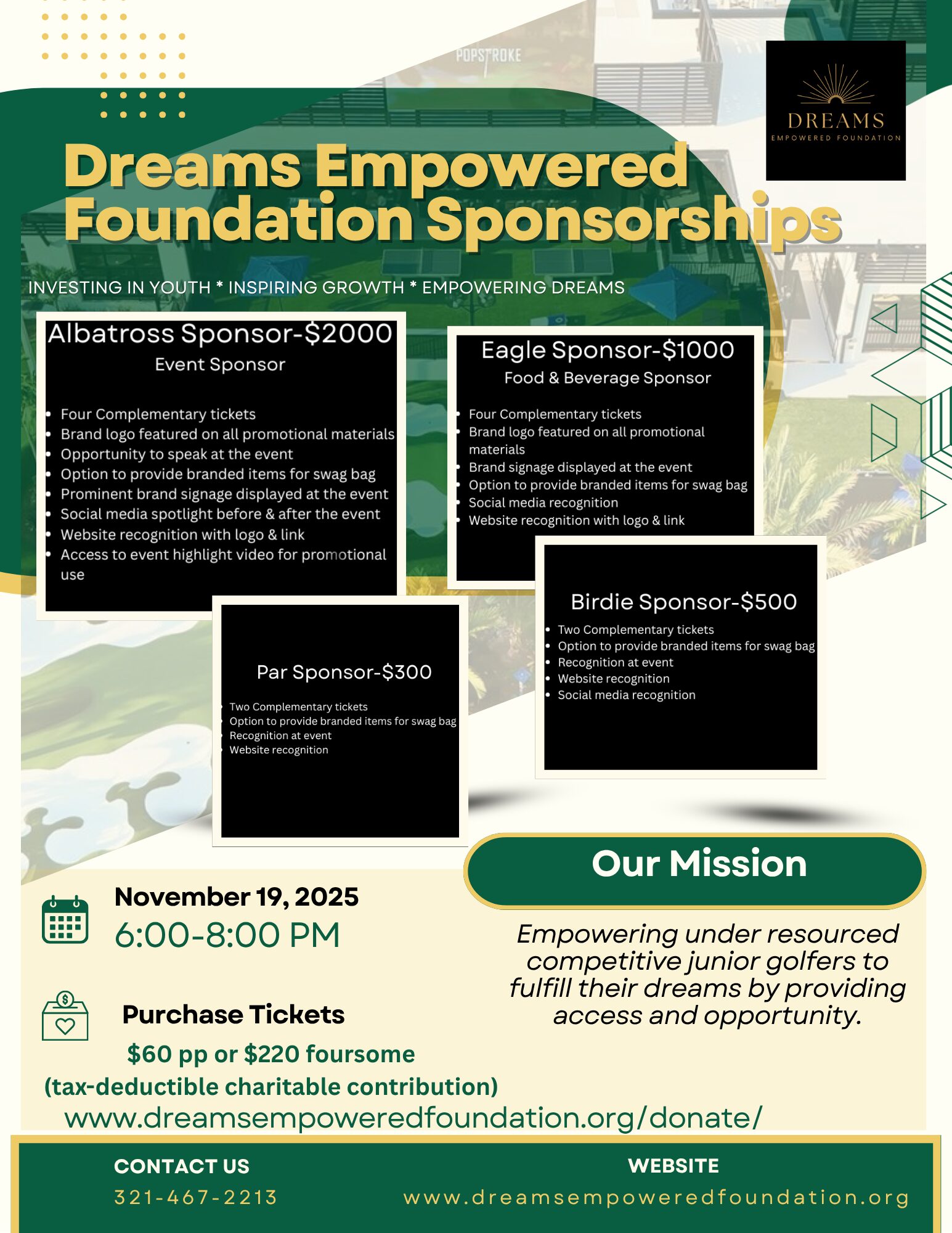 Excitement is in the air! Get ready to be part of something extraordinary at Dreams Empowered Foundation‘s Sponsorship Tiers. Our 501(c)(3) non-profit organization supports competitive junior golfers reach their dreams.